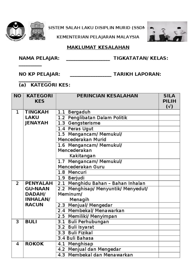 83 12 83 found this document useful 12 votes 5K views 6 pages. SSDM merupakan singkatan kepada Sistem Sahsiah Diri Murid merupakan penambahbaikan Sistem Salahlaku Disiplin Murid yang lama. Daripada penolong kanan hal ehwal murid guru disiplin atau guru bimbingan dan kaunseling telah menyenaraikan nama murid tingkatan 4 yang terlibat dalam salah laku.