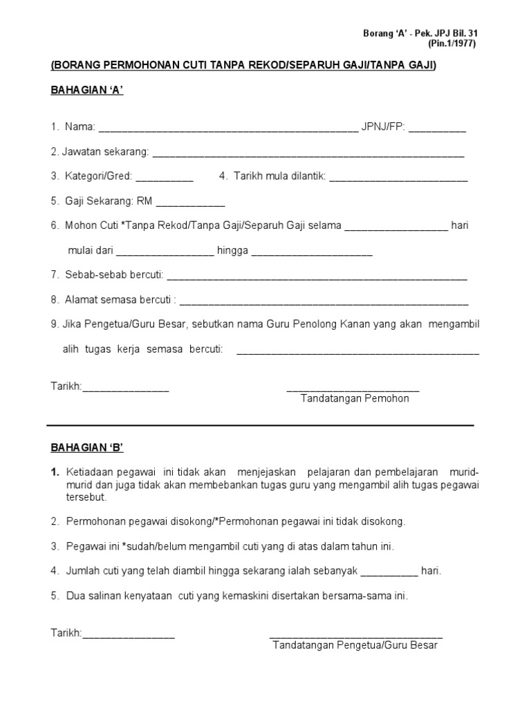 Borang Cuti Tanpa Rekod Separuh Gaji Tanpa Gaj