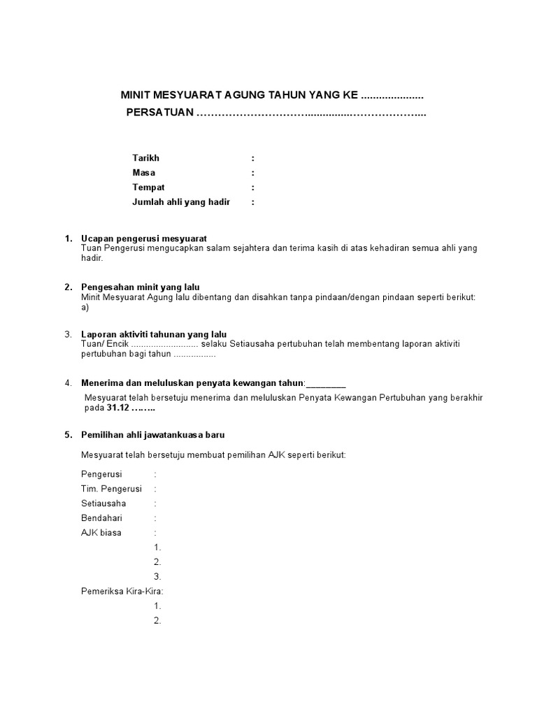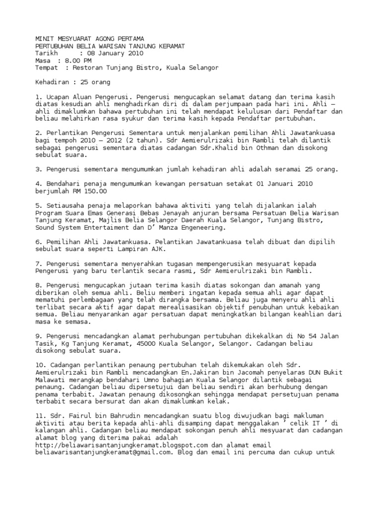 Minit Mesyuarat Agung Kali Pertama Persatuan Belia Warisan Tanjung Keramat Pdf