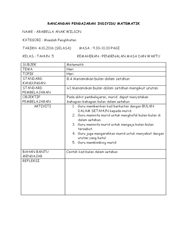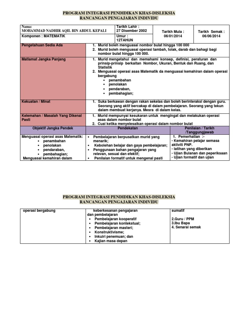 Contoh Rancangan Pengajaran Individu Matematik Pendidikan Khas