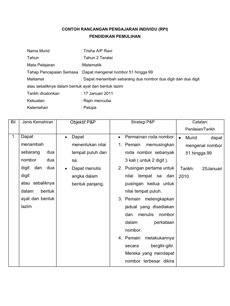 Contoh Rancangan Pengajaran Individu Rpi Pendidikan Pemulihan