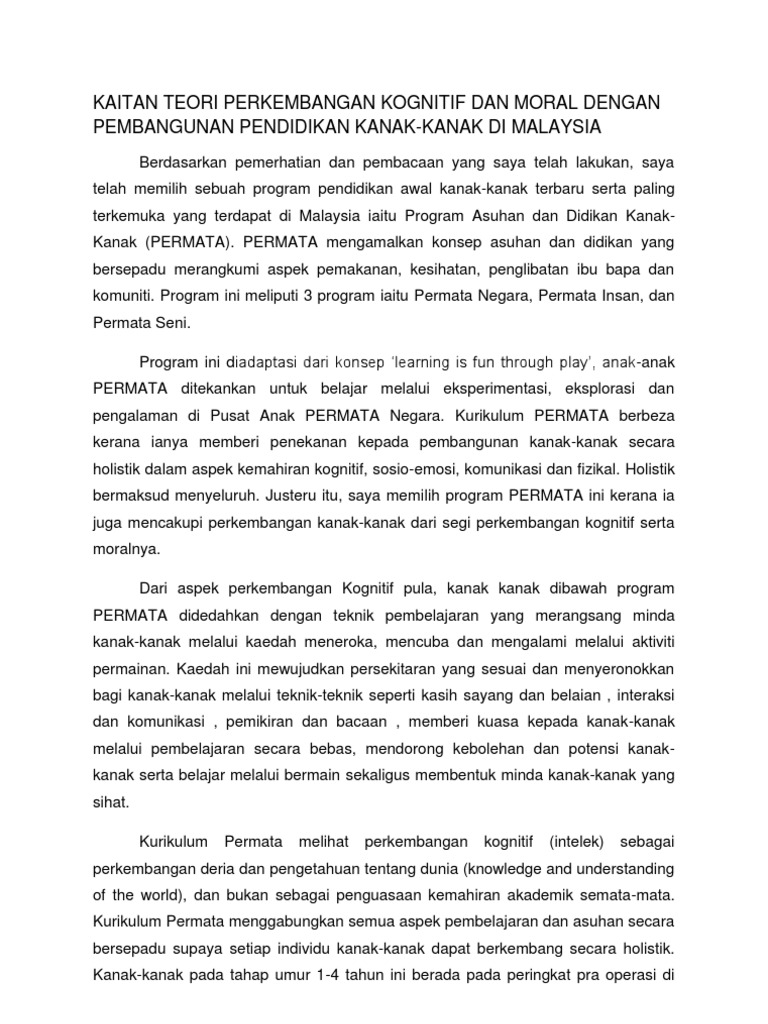 Kaitan Teori Perkembangan Kognitif Dan Moral Dengan Pembangunan Pendidikan Kanak Kanak Di Malaysia