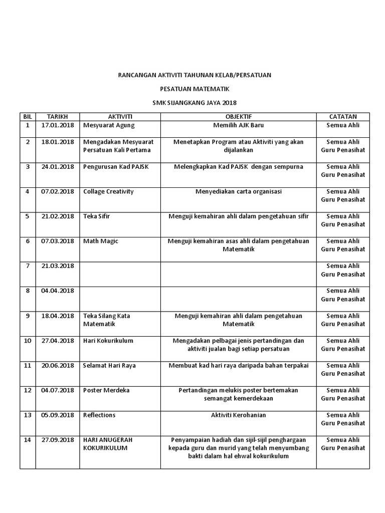 Rancangan Aktiviti Tahunan Persatuan Matematik Pdf