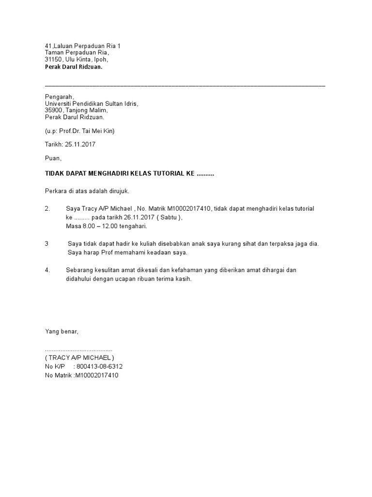 Surat Tidak Hadir Ke Kuliah Universiti